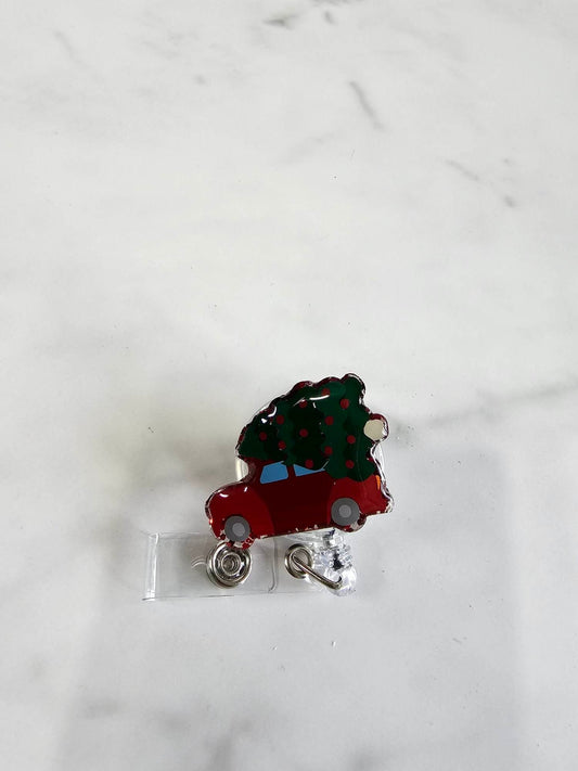 RED CAR WITH CHRISTMAS TREE BADGE REEL
