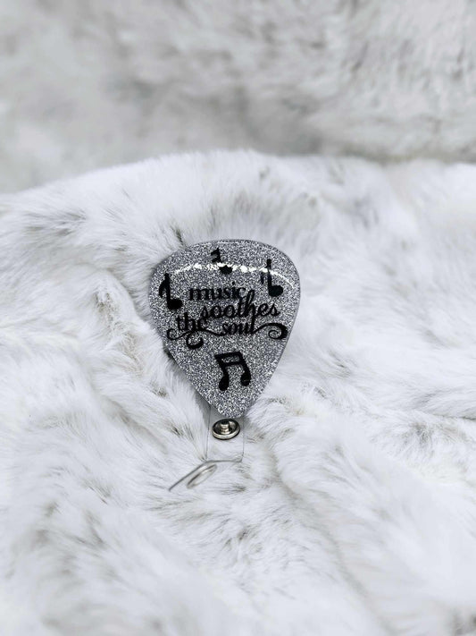 MUSIC SOOTHES THE SOUL GUITAR PICK BADGE REEL