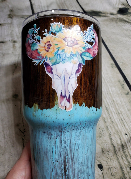 RUSTIC COW SKULL WITH SUNFLOWERS DISTRESSED TWO-TONE WOODGRAIN TUMBLER